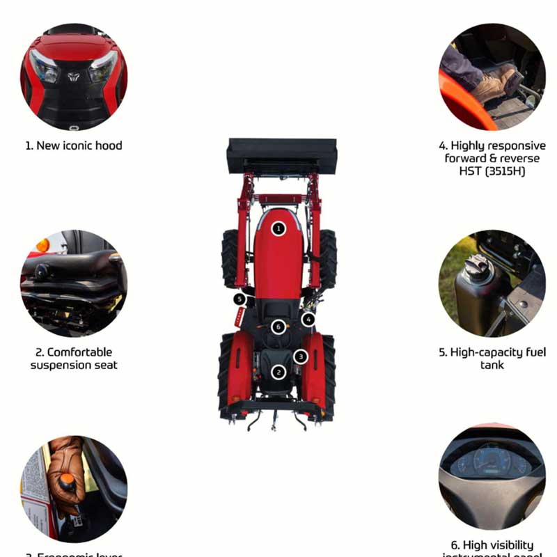 In the operator’s platform, the suspension seat and factory-installed joystick controls are designed for ultimate comfort and usability. The tractor’s high ground clearance makes operating on rocky or uneven terrain easier, and optional LED work lights and high-capacity front-end loader allow you to customize the tractor for the job.
